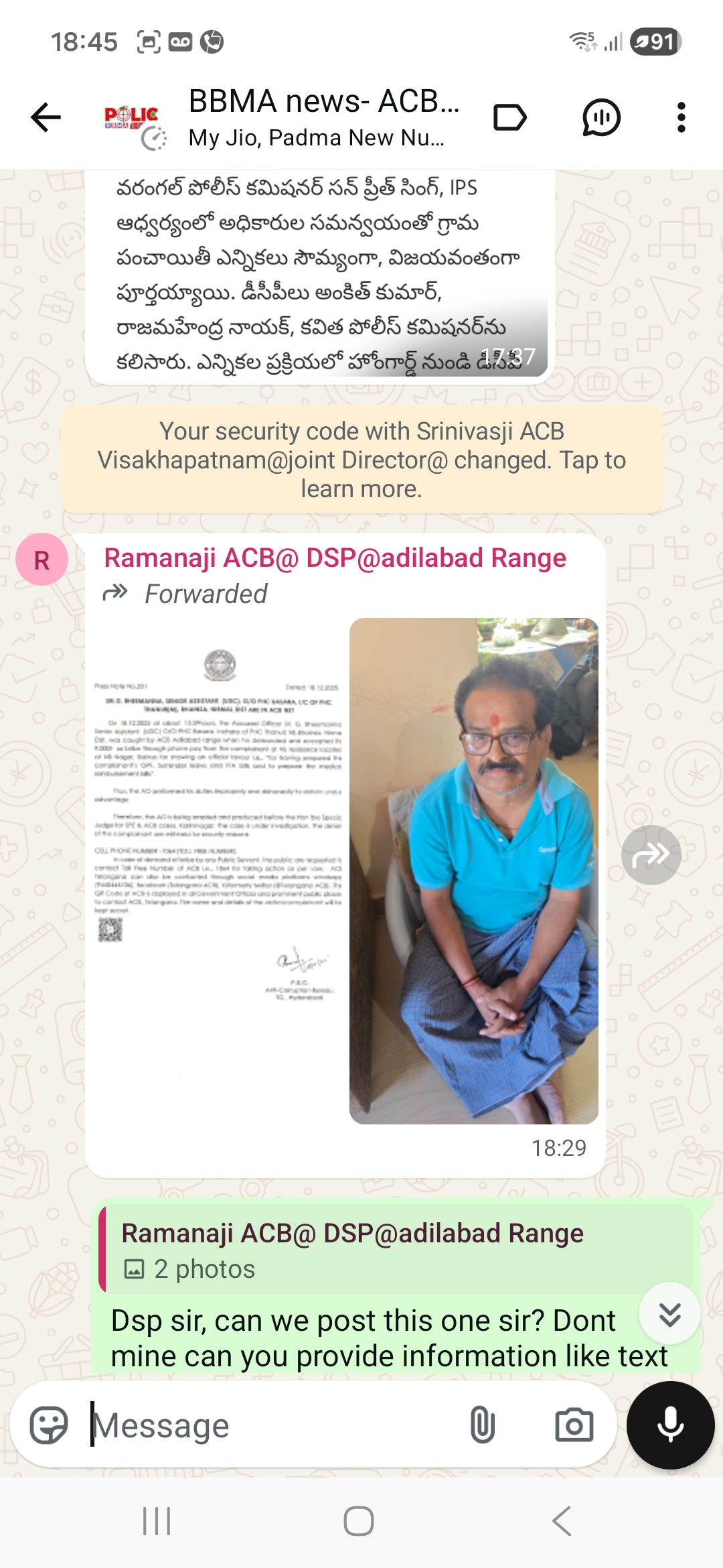 ఉమ్మడి పశ్చిమ గోదావరి జిల్లా అవినీతి నిరోధక శాఖ (ఏసిబి) డీఎస్పీగా జి.వి. కృష్ణారావు ఏలూరు లో ఉన్న ఏసీబీ కార్యాలయంలో బాధ్యతలు స్వీకరించారు. ఈయన 1991 బ్యాచ్ ఎస్ఐ గా ఉమ్మడి తూర్పుగోదావరి జిల్లా లో పనిచేశారు. తదనంతరం పశ్చిమగోదావరి జిల్లాలోని చింతలపూడి, పెరవలి పోలీస్ స్టేషన్లో పనిచేశారు. తరువాత సిఐగా పదోన్నతి పొంది ఉమ్మడి పశ్చిమగోదావరి జిల్లాలో పాలకొల్లు, ఏలూరు ఇంటెలిజెన్స్ ఆఫీసులో, జిల్లా క్రైమ్ రికార్డ్ బ్యూరోలోపనిచేశారు. 2020 సంవత్సరంలో డిఎస్పీగా పదోన్నతి పొంది ఏలూరు ఇంటెలిజెన్స్ ఆఫీసులో డిఎస్పీగా పనిచేసి తరువాత పాలకొండ SDPO గా, APSP 8th బెటాలియన్ లో DSP గాపనిచేసి అవినీతి నిరోధక శాఖ (ఏసిబి) డీఎస్పీగా, ఏలూరు కార్యాలయములో బాధ్యతలు స్వీకరించినారు. అవినీతి సమాచారం పై ప్రజలు నిర్భయముగా ఫోన్ ద్వారా కానీ, ఆఫీసుకు వచ్చిగాని తెలియజేయవచ్చని కోరినారు. అదేవిధంగా టోల్ ఫ్రీ నెంబర్ 1064 కి ఫోన్ చేసి సమాచారం ఇవ్వవచ్చని అంతే కాకుండా DSP గారి మొబైల్ నెంబర్ 9440441657 కి ఫోన్ చేసి సమాచారం ఇచ్చిన వారి పేరు గోప్యంగా ఉంచుతాము అని తెలియజేసినారు…
