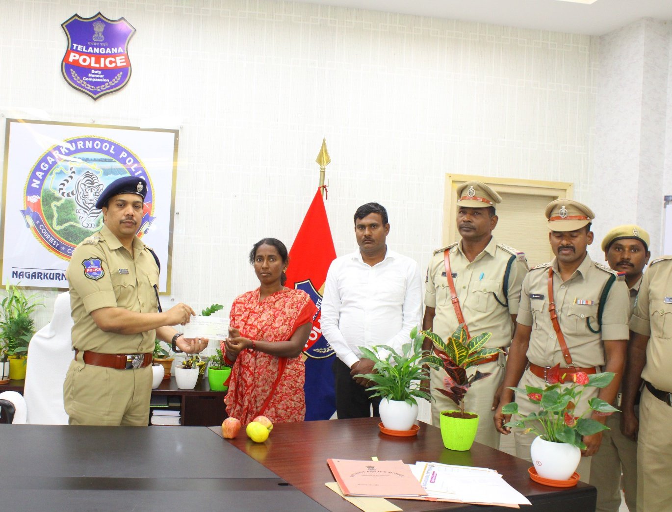 నాగర్ కర్నూల్ జిల్లా ఎస్పీ ఆఫీసులో జిల్లా ఎస్పీ గారి చేతుల మీదుగా పెద్దకొత్తపల్లి పోలీస్ స్టేషన్లో విధులు నిర్వహిస్తూ తేదీ:24.10.2025 నాడు రోడ్డు ప్రమాదంలో చనిపోయిన పసుపుల గ్రామం కోడేరు మండలనీకి చెందిన హోంగార్డు M.వెంకటస్వామి Hg 940 భార్య చెన్నమ్మ కి Rs.20,000/- రూపాయల ఆర్థిక సహాయం అందజేయడం జరిగింది.