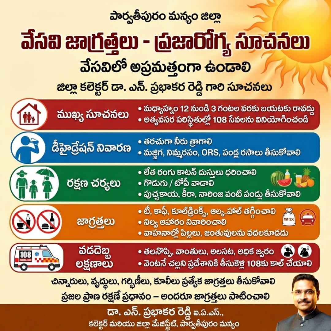 పార్వతీపురం: జిల్లాలో పెరుగుతున్న ఉష్ణోగ్రతల దృష్ట్యా ప్రజలు ముందస్తు జాగ్రత్తలు తప్పనిసరిగా పాటించాలని జిల్లా కలెక్టర్ డా. ఎన్. ప్రభాకర రెడ్డి గారు సూచించారు. వడదెబ్బ వల్ల ప్రాణాపాయం కలగకుండా ప్రతి ఒక్కరూ అప్రమత్తంగా ఉండాలని తెలిపారు.