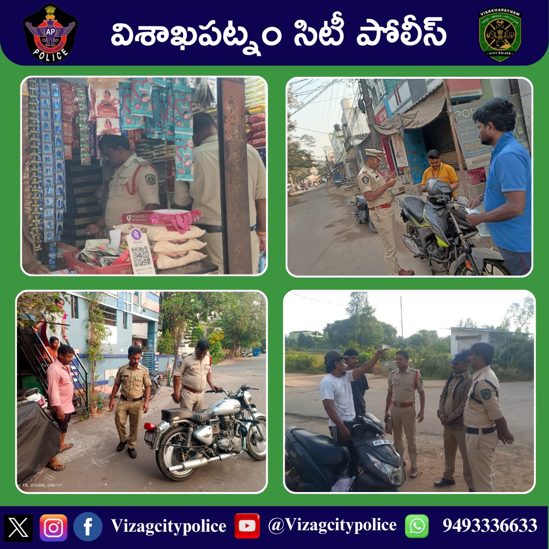 డా. శంఖబ్రత బాగ్చి, ఐ.పి.ఎస్., కమీషనర్ గారి ఆదేశాల మేరకు దువ్వాడ & ద్వారక పోలీస్ స్టేషన్ పరిధిలో శాంతి భద్రతల పరిరక్షణతో పాటు నేరాల నియంత్రణ లక్ష్యంగా ప్రత్యేకంగా “కార్డన్ & సెర్చ్” ఆపరేషన్ నిర్వహించబడింది. ఈ ఆపరేషన్లో పోలీసులు విస్తృతంగా తనిఖీలు చేపట్టి అనుమానాస్పద వ్యక్తులు మరియు వాహనాలను పరిశీలించారు. తనిఖీల సమయంలో సరైన ధృవపత్రాలు లేని 11 వాహనాలను గుర్తించి స్వాధీనం చేసుకున్నారు. ఈ చర్యల ద్వారా ప్రజల్లో భద్రతా భావన పెంపొందించడంతో పాటు నేరాల నియంత్రణకు దోహదపడుతుంది. ఇటువంటి ఆపరేషన్లు భవిష్యత్తులో కూడా కొనసాగుతాయని అధికారులు తెలిపారు. ప్రజలు తమ వాహనాలకు సంబంధించిన పత్రాలను ఎప్పటికప్పుడు సరిచూసుకోవాలని, చట్టాలను పాటించాలని పోలీస్ శాఖ సూచించింది. @APPOLICE100