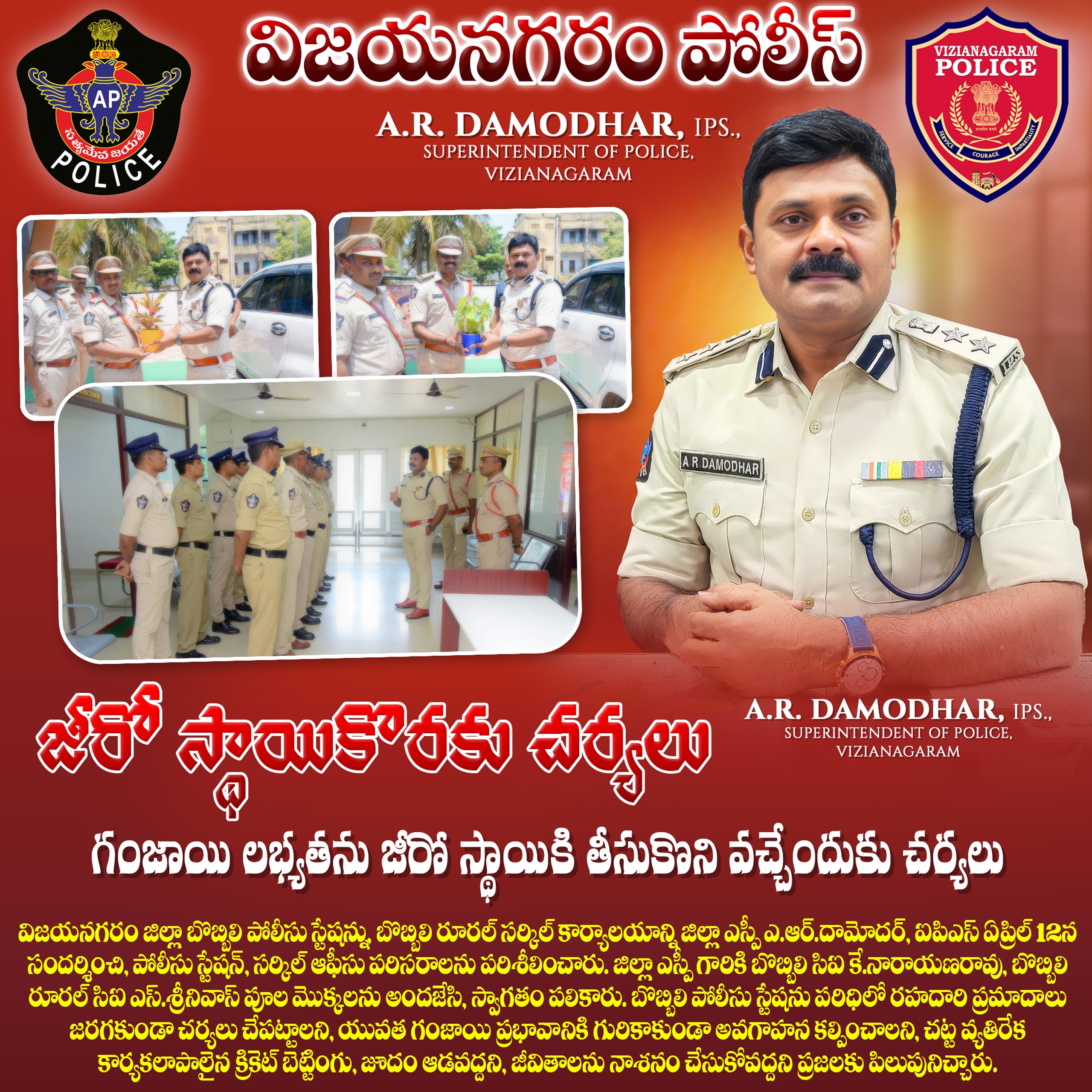 విజయనగరం జిల్లా ఎస్పీ ఎ.ఆర్. దామోదర్, ఐపిఎస్ గారు గంజాయి లభ్యతను పూర్తిగా నిర్మూలించడం పోలీస్ శాఖ ముఖ్య లక్ష్యమని స్పష్టం చేశారు. జిల్లాలో గంజాయి రవాణా, నిల్వ, విక్రయాలపై కఠిన నిఘా ఏర్పాటు చేసి ప్రత్యేక దళాలతో విస్తృతంగా తనిఖీలు నిర్వహిస్తున్నట్లు తెలిపారు. యువతను మత్తు పదార్థాల నుండి దూరంగా ఉంచేందుకు అవగాహన కార్యక్రమాలు చేపడుతున్నామని పేర్కొన్నారు. గంజాయి అక్రమ వ్యాపారంలో పాల్గొనే వారిపై కఠిన చట్టపరమైన చర్యలు తీసుకుంటామని హెచ్చరించారు. ప్రజలు కూడా పోలీసులకు సహకరించి అనుమానాస్పద కార్యకలాపాలపై సమాచారం అందించాలని కోరారు. సమాజాన్ని మత్తు రహితంగా మార్చేందుకు అందరూ కలిసి పనిచేయాల్సిన అవసరం ఉందని, గంజాయి నిర్మూలనలో రాజీ ఉండదని స్పష్టం చేశారు. @APPOLICE100