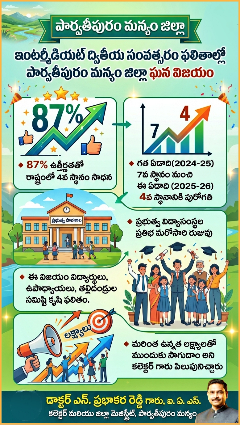 పార్వతీపురం మన్యం జిల్లా ఇంటర్మీడియట్ ఫలితాల్లో 87% ఉత్తీర్ణతతో రాష్ట్రంలో 4వ స్థానంలో నిలిచి విశేష ప్రగతిని సాధించింది. గత ఏడాది 7వ స్థానంలో ఉన్న జిల్లా ఈసారి టాప్-4లో నిలవడం గర్వకారణమని జిల్లా కలెక్టర్ డా. ఎన్. ప్రభాకర రెడ్డి తెలిపారు. జాయింట్ కలెక్టర్ సి. యశ్వంత్ కుమార్ రెడ్డితో కలిసి ఉత్తమ ఫలితాలు సాధించిన విద్యార్థులు, కళాశాలలను ఆయన అభినందించారు.
