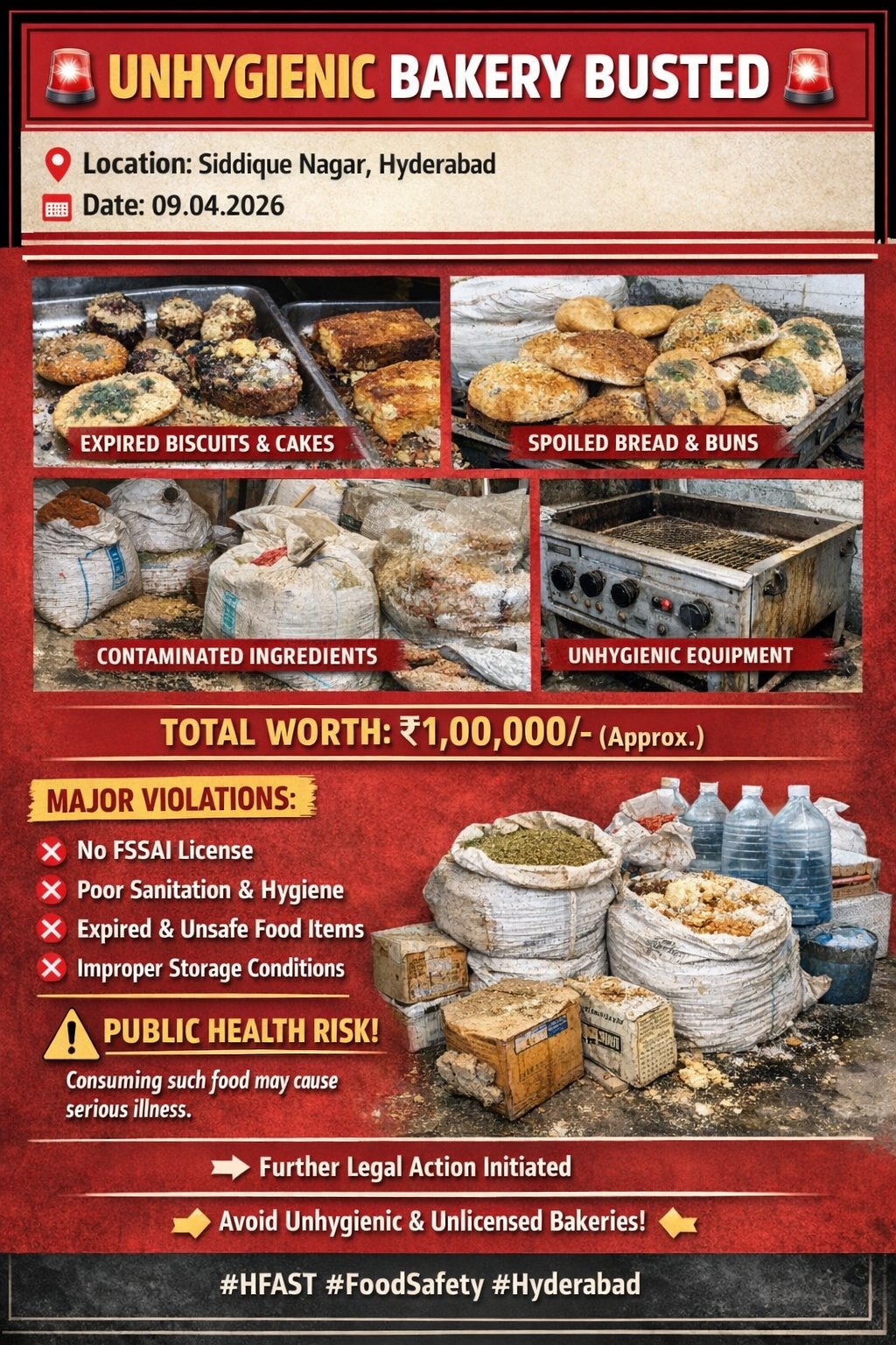 హైదరాబాద్ నగరంలోని సిద్ధిక్ నగర్ ప్రాంతంలో అనారోగ్యకర పరిస్థితుల్లో నడుస్తున్న ఒక బేకరీపై పోలీసులు మరియు సంబంధిత అధికారులు సంయుక్తంగా దాడులు నిర్వహించారు. తనిఖీల సమయంలో గడువు ముగిసిన పదార్థాలను ఉపయోగించి బేకరీ ఉత్పత్తులు తయారు చేస్తున్నట్లు గుర్తించారు. ప్రజల ఆరోగ్యాన్ని ప్రమాదంలోకి నెట్టే విధంగా ఆహార పదార్థాలను తయారు చేసి విక్రయిస్తున్నారని అధికారులు వెల్లడించారు.